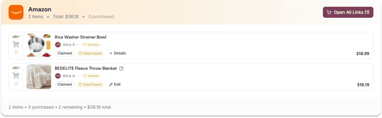 Track every gift's journey — claimed, purchased, shipped, wrapped. Your personal shopping list keeps everything organized across all your events and groups.
